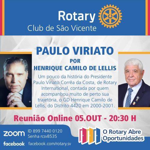 Conheça um pouco mais da historia do nosso eterno Presidente PAULO VIRIATO CORREA DA COSTA, de Rotary Internacional, contada por quem acompanhou muito de perto sua trajetoria, GD Henrique Camie Lellis